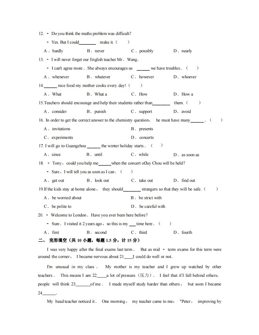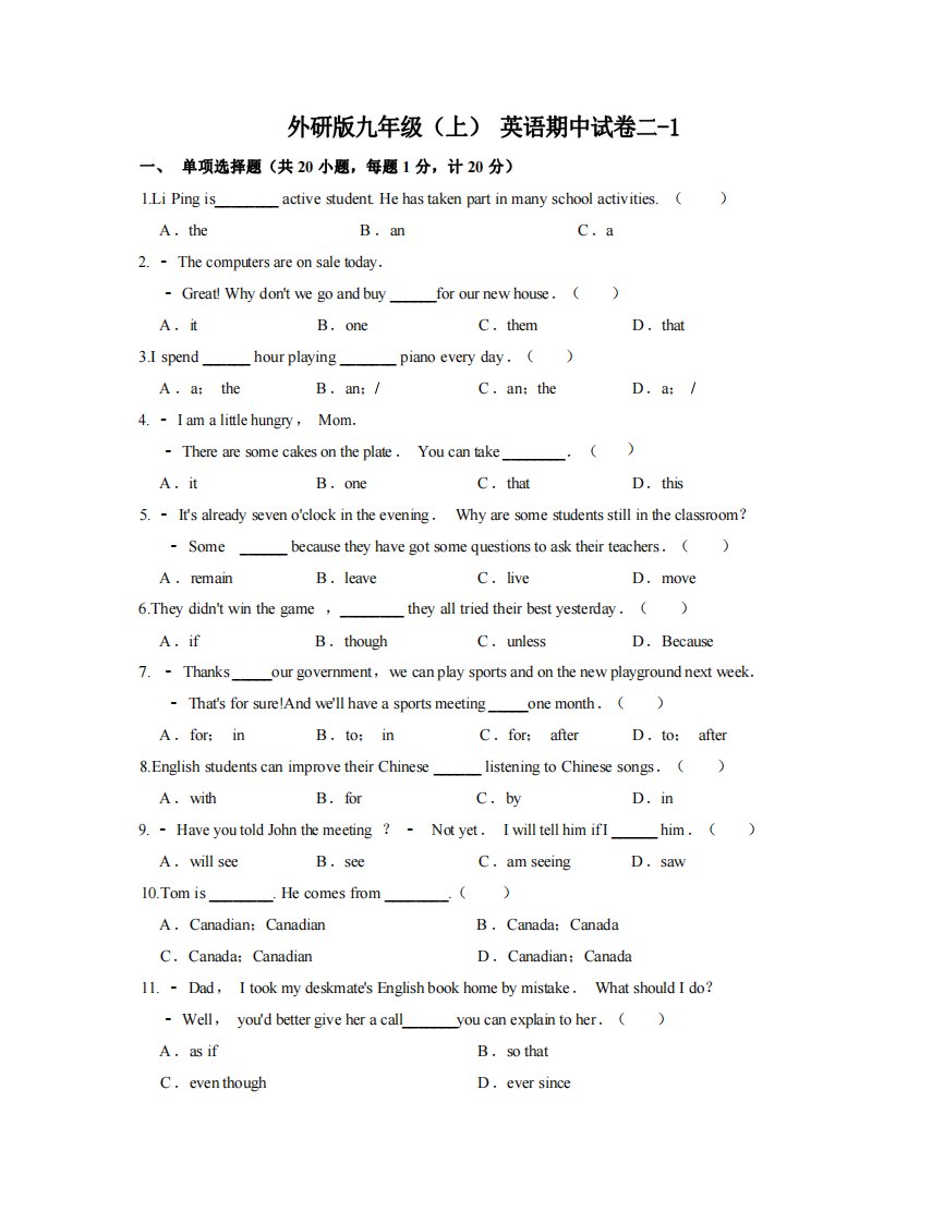 当前位置: 首页初中资源初中九年级正文 九年级(上)英语期中试卷2-1卷外研版_共10页 初中九年级 4 天前 0 0 5 以上为部分内容预览,如需源文档请登录您的会员账号进行下载! 声明:本站所有文章,如无特殊说明或标注,均为本站原创发布。任何个人或组织,在未征得本站同意时,禁止复制、盗用、采集、发布本站内容到任何网站、书籍等各类媒体平台。如若本站内容侵犯了原著者的合法权益,可联系我们进行处理。 尚学资源永久会员 打赏 收藏 海报 链接