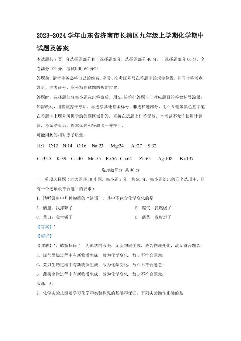 2023-2024学年山东省济南市长清区九年级上学期化学期中试题及答案(Word版)_共22页