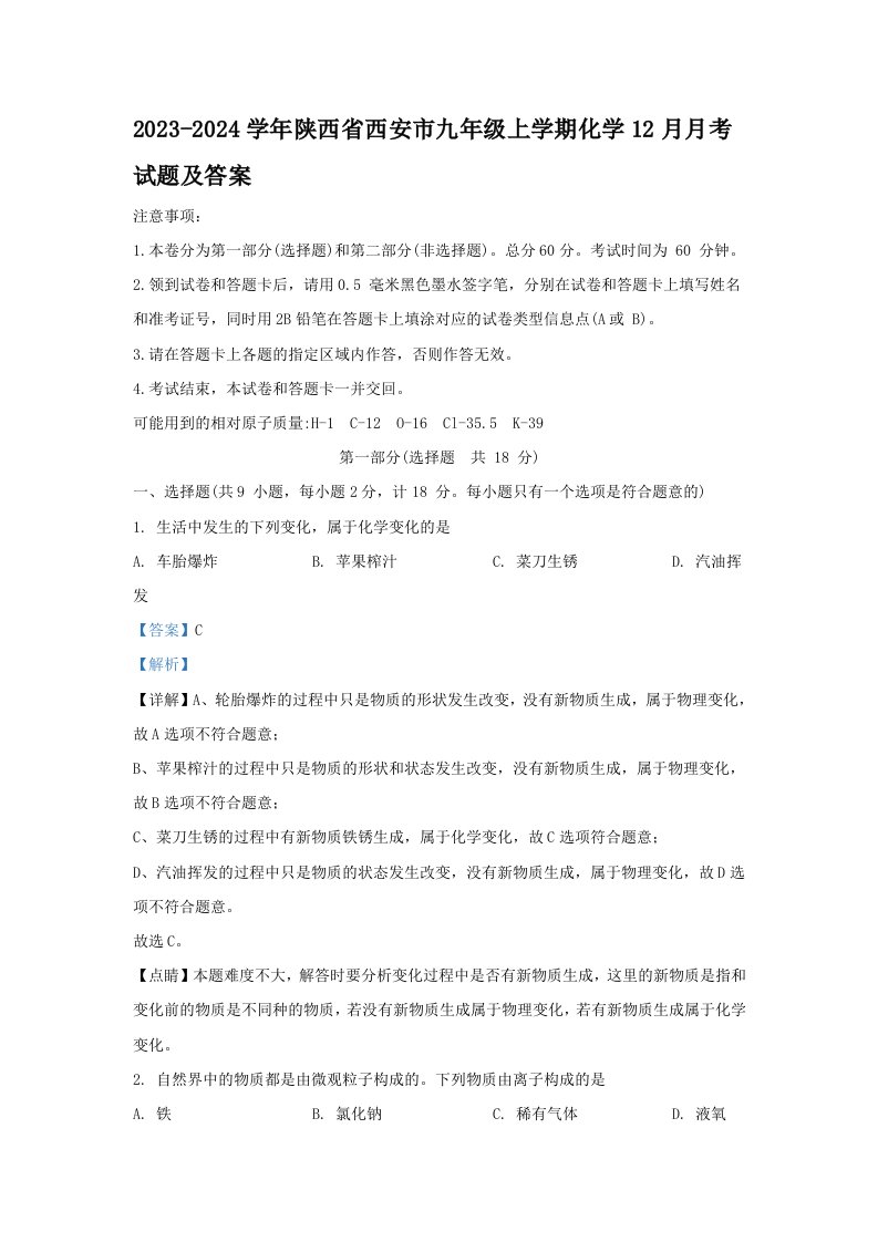 当前位置: 首页初中资源初中九年级正文 2023-2024学年陕西省西安市九年级上学期化学12月月考试题及答案(Word版)_共15页 初中九年级 5 天前 0 0 10 以上为部分内容预览,如需源文档请登录您的会员账号进行下载! 声明:本站所有文章,如无特殊说明或标注,均为本站原创发布。任何个人或组织,在未征得本站同意时,禁止复制、盗用、采集、发布本站内容到任何网站、书籍等各类媒体平台。如若本站内容侵犯了原著者的合法权益,可联系我们进行处理。 尚学资源永久会员 打赏 收藏 海报 链接