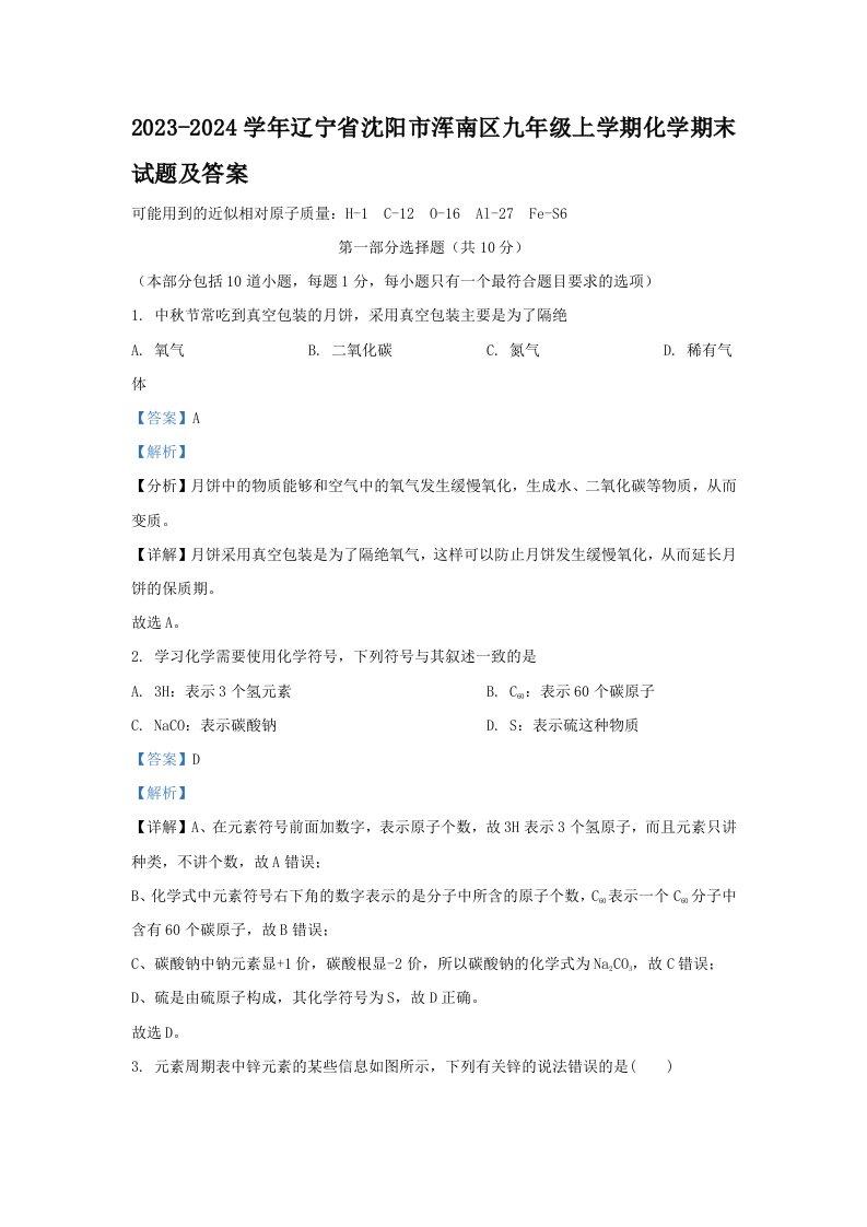 2023-2024学年辽宁省沈阳市浑南区九年级上学期化学期末试题及答案(Word版)_共14页