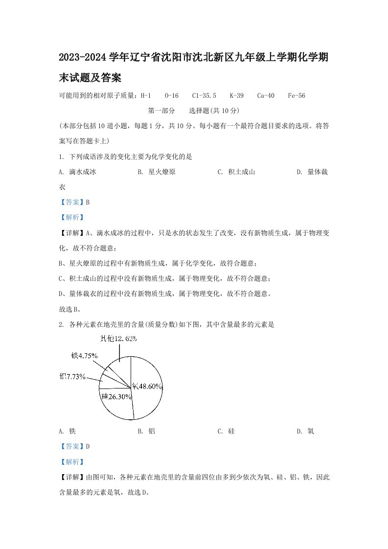 当前位置: 首页初中资源初中九年级正文 2023-2024学年辽宁省沈阳市沈北新区九年级上学期化学期末试题及答案(Word版)_共14页 初中九年级 4 天前 0 0 10 以上为部分内容预览,如需源文档请登录您的会员账号进行下载! 声明:本站所有文章,如无特殊说明或标注,均为本站原创发布。任何个人或组织,在未征得本站同意时,禁止复制、盗用、采集、发布本站内容到任何网站、书籍等各类媒体平台。如若本站内容侵犯了原著者的合法权益,可联系我们进行处理。 尚学资源永久会员 打赏 收藏 海报 链接