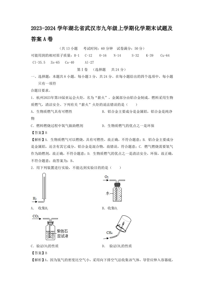 2023-2024学年湖北省武汉市九年级上学期化学期末试题及答案A卷(Word版)_共10页