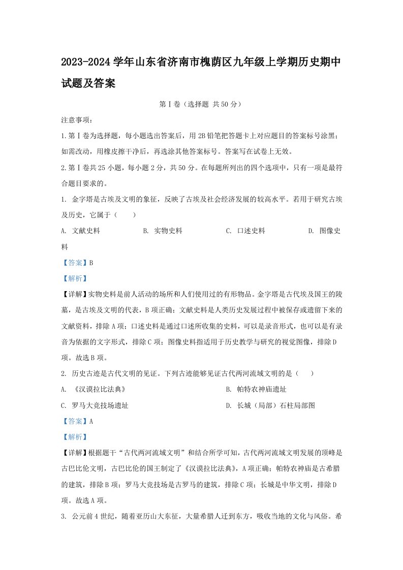 2023-2024学年山东省济南市槐荫区九年级上学期历史期中试题及答案(Word版)_共17页