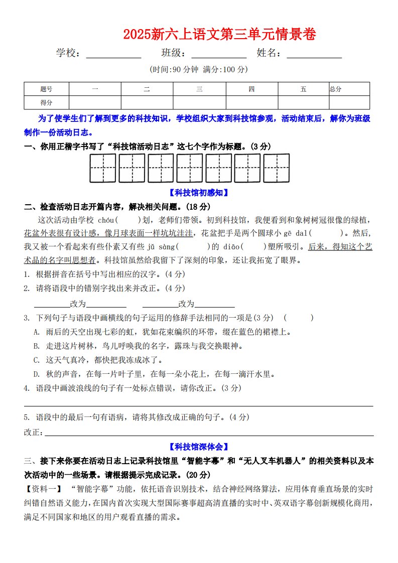 当前位置: 首页小学资源小学六年级正文 六上语文第三单元情景卷+答案6页_共6页 小学六年级 2 小时前 0 0 5 以上为部分内容预览,如需源文档请登录您的会员账号进行下载! 声明:本站所有文章,如无特殊说明或标注,均为本站原创发布。任何个人或组织,在未征得本站同意时,禁止复制、盗用、采集、发布本站内容到任何网站、书籍等各类媒体平台。如若本站内容侵犯了原著者的合法权益,可联系我们进行处理。 尚学资源永久会员 打赏 收藏 海报 链接