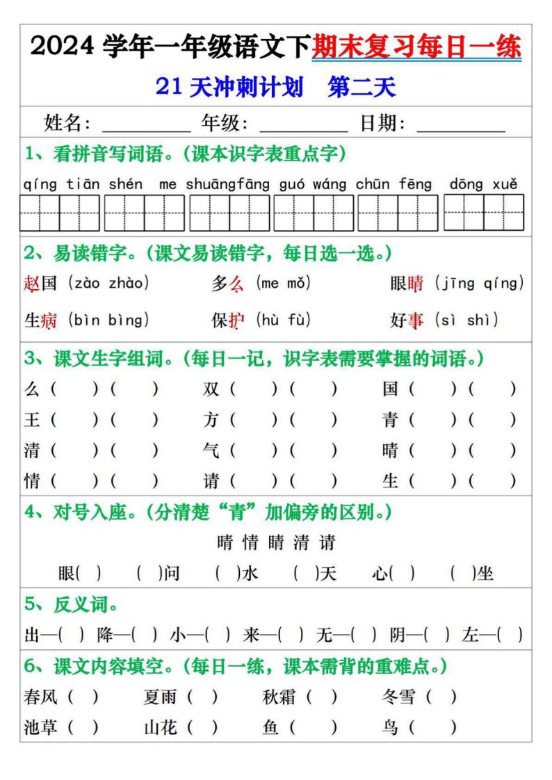 当前位置: 首页小学资源小学一年级正文 一年级语文下册期末复习每日一练21天冲刺计划_共42页 小学一年级 2 周前 0 0 15 以上为部分内容预览,如需源文档请登录您的会员账号进行下载! 声明:本站所有文章,如无特殊说明或标注,均为本站原创发布。任何个人或组织,在未征得本站同意时,禁止复制、盗用、采集、发布本站内容到任何网站、书籍等各类媒体平台。如若本站内容侵犯了原著者的合法权益,可联系我们进行处理。 尚学资源永久会员 打赏 收藏 海报 链接