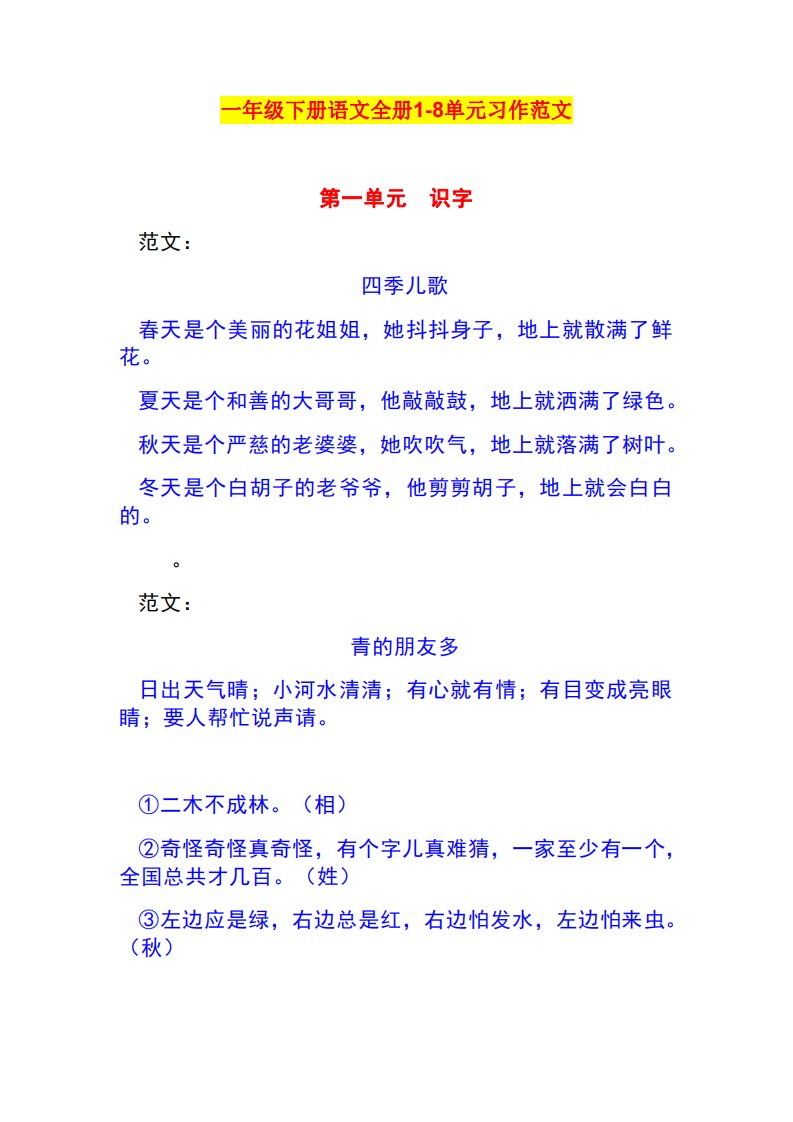 一年级语文下册1-8单元作文范文_共15页