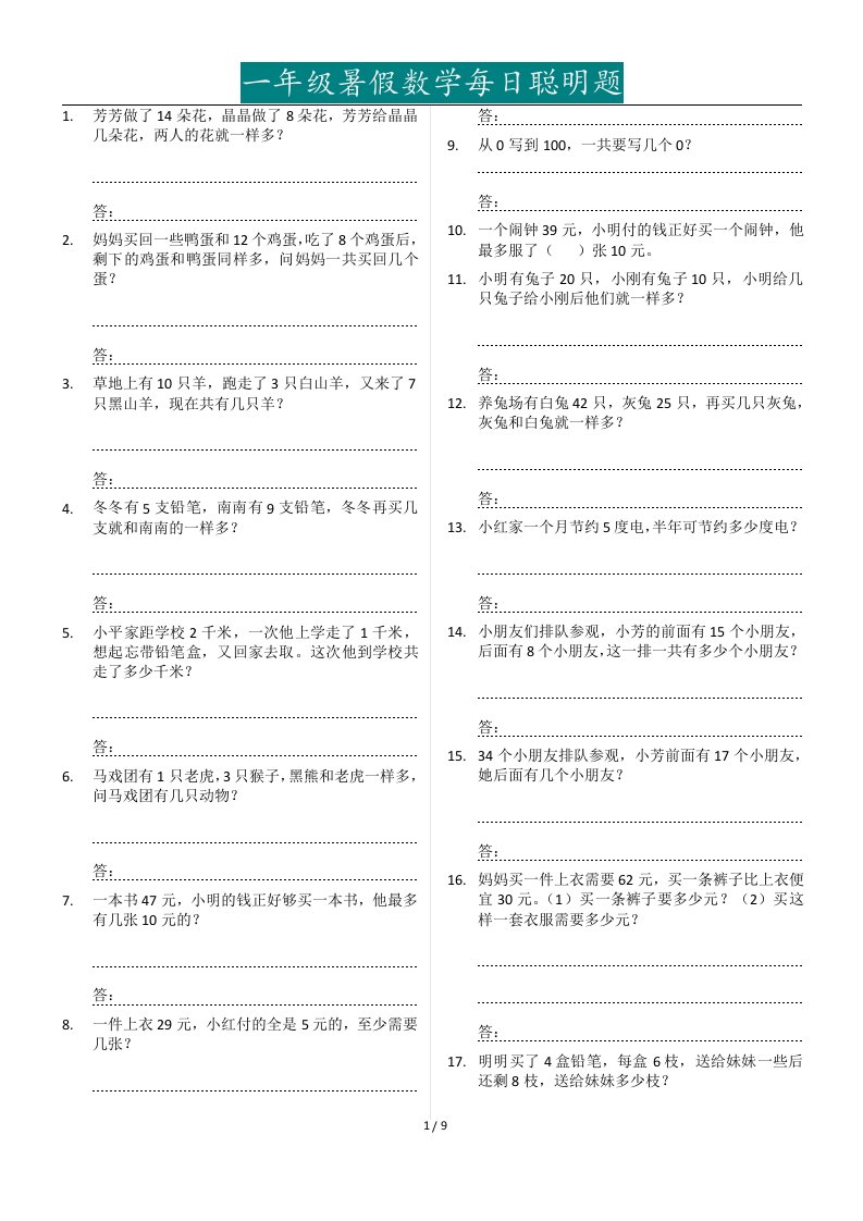 当前位置: 首页小学资源小学一年级正文 一年级下册暑假数学每日聪明题127道_共9页 小学一年级 2 周前 0 0 5 以上为部分内容预览,如需源文档请登录您的会员账号进行下载! 声明:本站所有文章,如无特殊说明或标注,均为本站原创发布。任何个人或组织,在未征得本站同意时,禁止复制、盗用、采集、发布本站内容到任何网站、书籍等各类媒体平台。如若本站内容侵犯了原著者的合法权益,可联系我们进行处理。 尚学资源永久会员 打赏 收藏 海报 链接