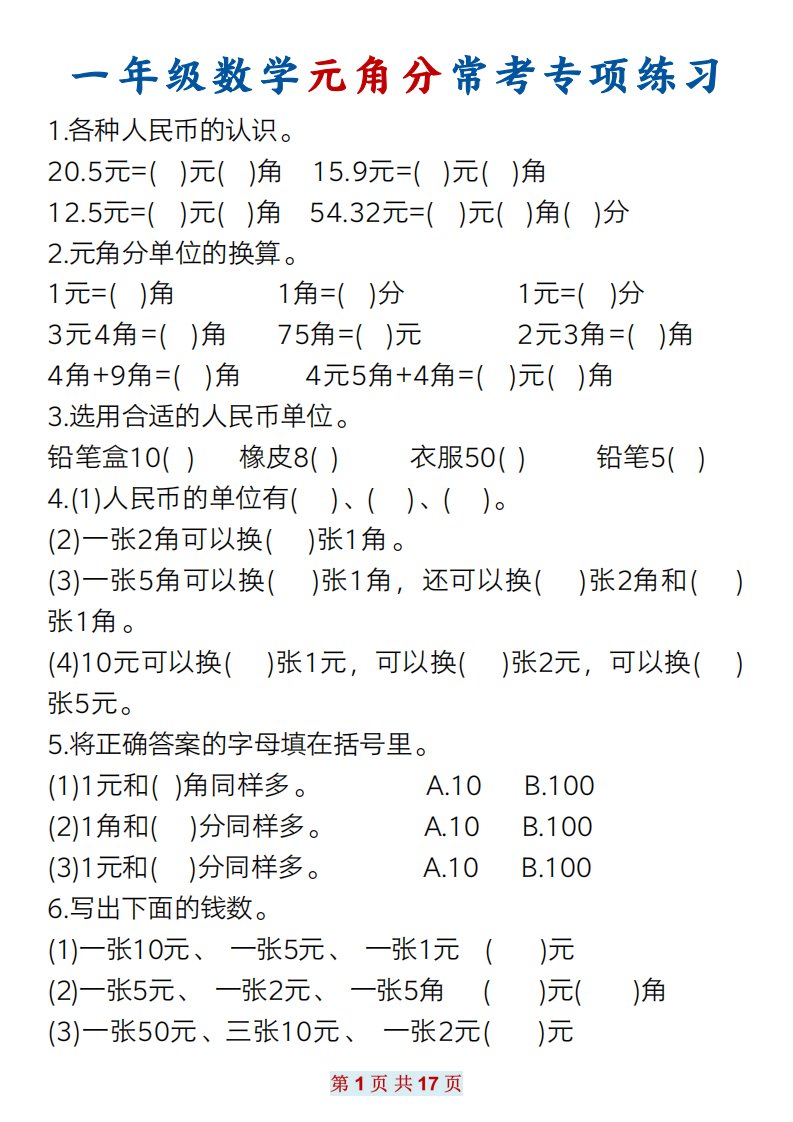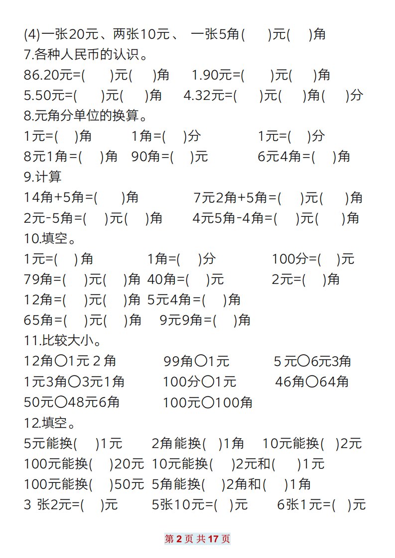 当前位置: 首页小学资源小学一年级正文 一下数学元角分常考专项练习(17页)_共17页 小学一年级 2 周前 0 0 10 以上为部分内容预览,如需源文档请登录您的会员账号进行下载! 声明:本站所有文章,如无特殊说明或标注,均为本站原创发布。任何个人或组织,在未征得本站同意时,禁止复制、盗用、采集、发布本站内容到任何网站、书籍等各类媒体平台。如若本站内容侵犯了原著者的合法权益,可联系我们进行处理。 尚学资源永久会员 打赏 收藏 海报 链接