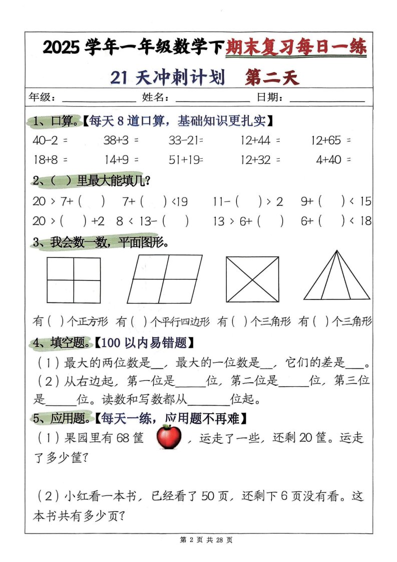 25学年一下数学期末复习每日一练21天冲刺计划第二套含答案28页_共28页