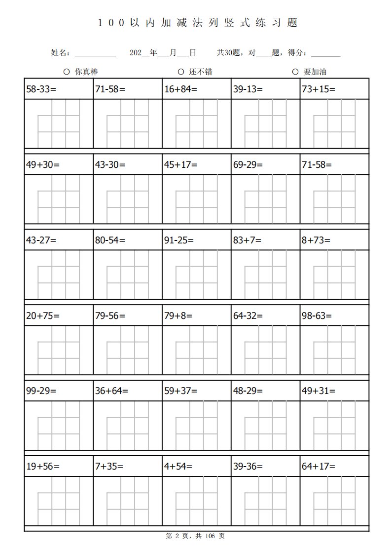 当前位置: 首页小学资源小学一年级正文 一下数学100以内加减法列竖式计算专项练习题3180题(106页)_共106页 小学一年级 2 周前 0 0 15 以上为部分内容预览,如需源文档请登录您的会员账号进行下载! 声明:本站所有文章,如无特殊说明或标注,均为本站原创发布。任何个人或组织,在未征得本站同意时,禁止复制、盗用、采集、发布本站内容到任何网站、书籍等各类媒体平台。如若本站内容侵犯了原著者的合法权益,可联系我们进行处理。 尚学资源永久会员 打赏 收藏 海报 链接