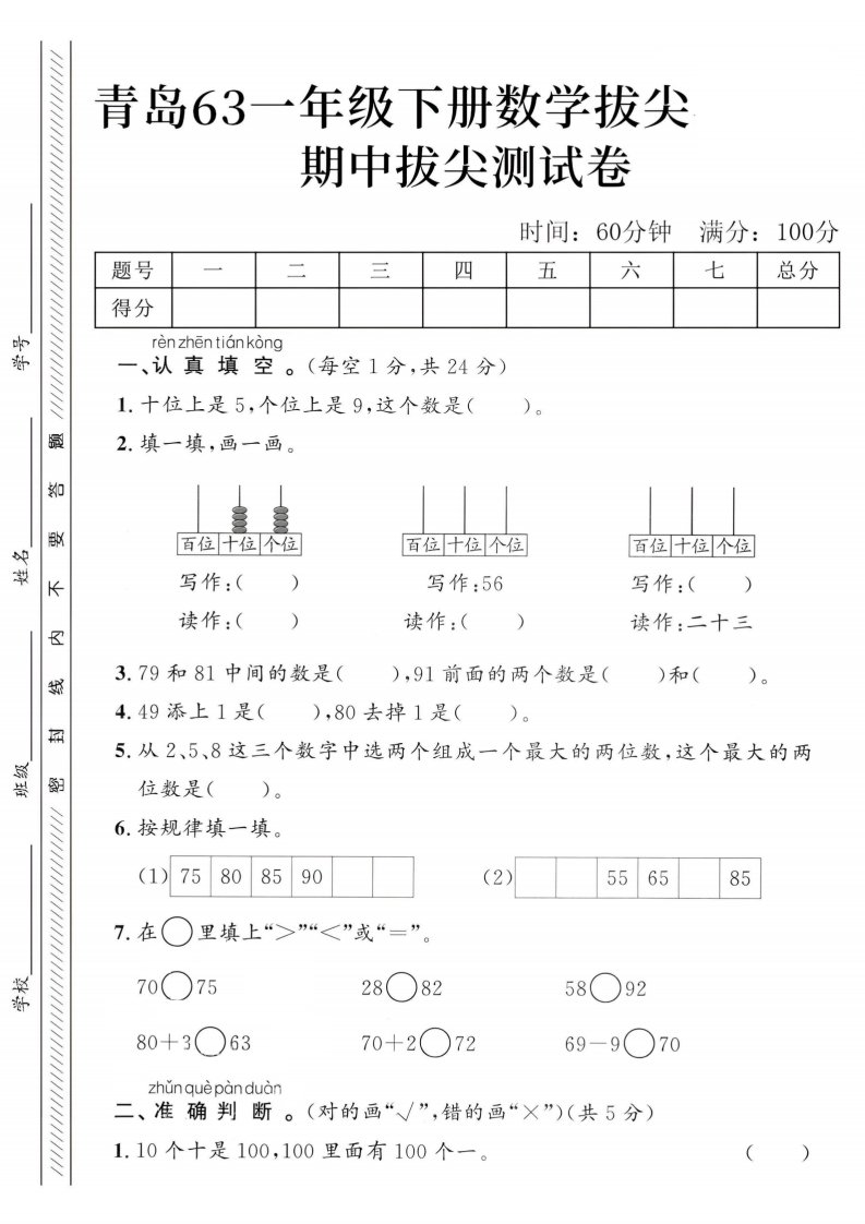 2025青岛63一下数学第四单元拔尖测试卷2_共5页