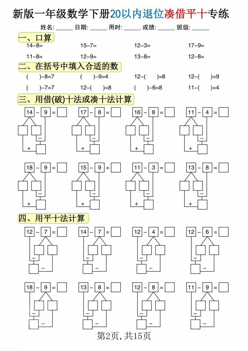 新一下数学20以内退位凑借平十专练(15页)_共15页