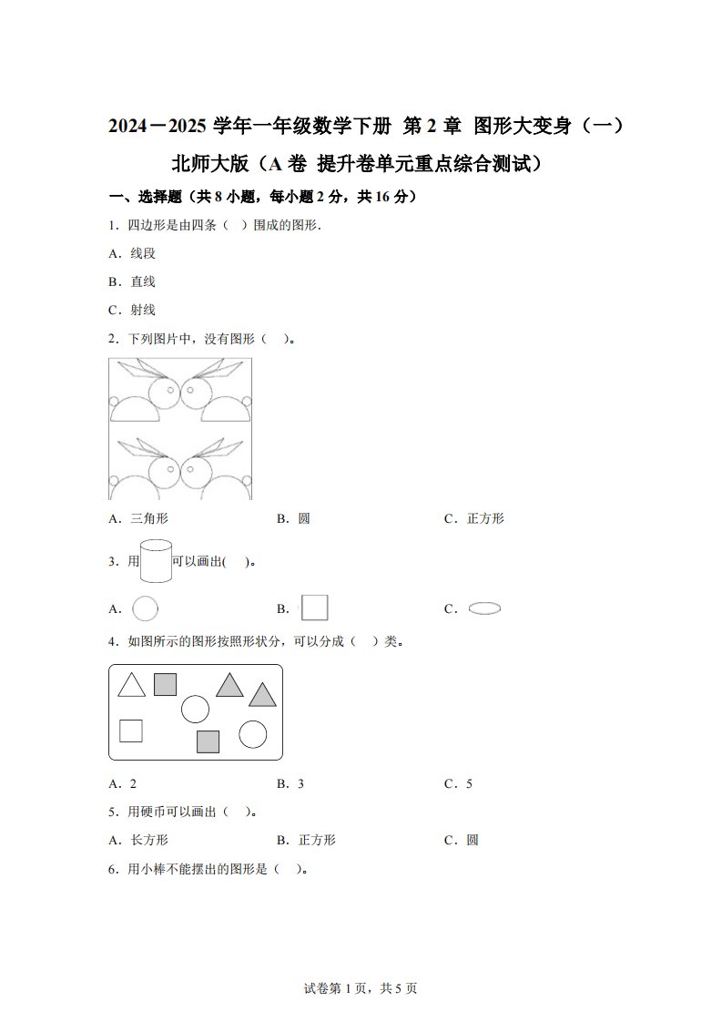 当前位置: 首页小学资源小学一年级正文 北师大版数学一年级下册第二单元《图形大变身(一)》重点综合测试卷_共14页 小学一年级 2 周前 0 0 10 以上为部分内容预览,如需源文档请登录您的会员账号进行下载! 声明:本站所有文章,如无特殊说明或标注,均为本站原创发布。任何个人或组织,在未征得本站同意时,禁止复制、盗用、采集、发布本站内容到任何网站、书籍等各类媒体平台。如若本站内容侵犯了原著者的合法权益,可联系我们进行处理。 尚学资源永久会员 打赏 收藏 海报 链接
