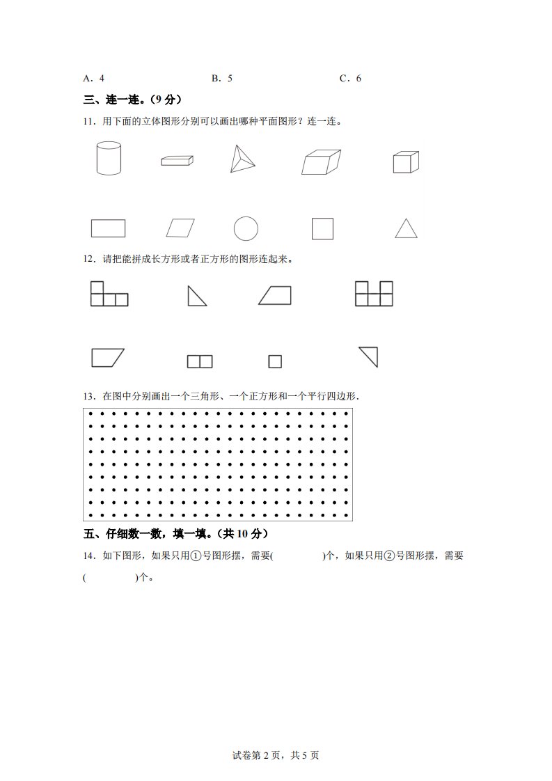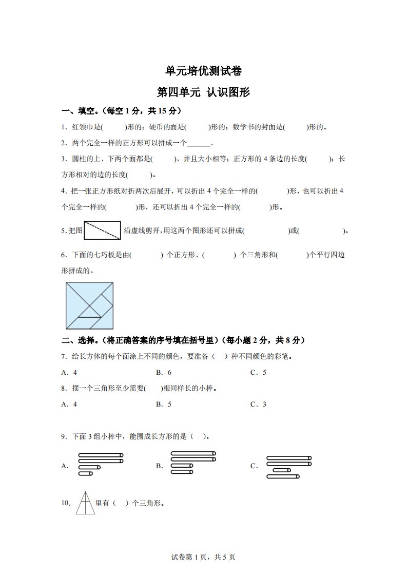 青岛63版数学一年级下册第四单元《牧童——认识图形》单元测试卷_共15页