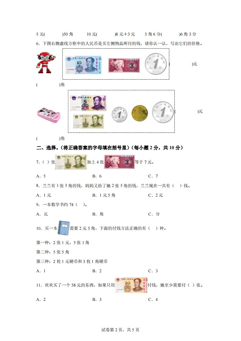 当前位置: 首页小学资源小学一年级正文 青岛63版数学一年级下册第六单元《人民币的认识》单元测试卷_共12页 小学一年级 2 周前 0 0 10 以上为部分内容预览,如需源文档请登录您的会员账号进行下载! 声明:本站所有文章,如无特殊说明或标注,均为本站原创发布。任何个人或组织,在未征得本站同意时,禁止复制、盗用、采集、发布本站内容到任何网站、书籍等各类媒体平台。如若本站内容侵犯了原著者的合法权益,可联系我们进行处理。 尚学资源永久会员 打赏 收藏 海报 链接