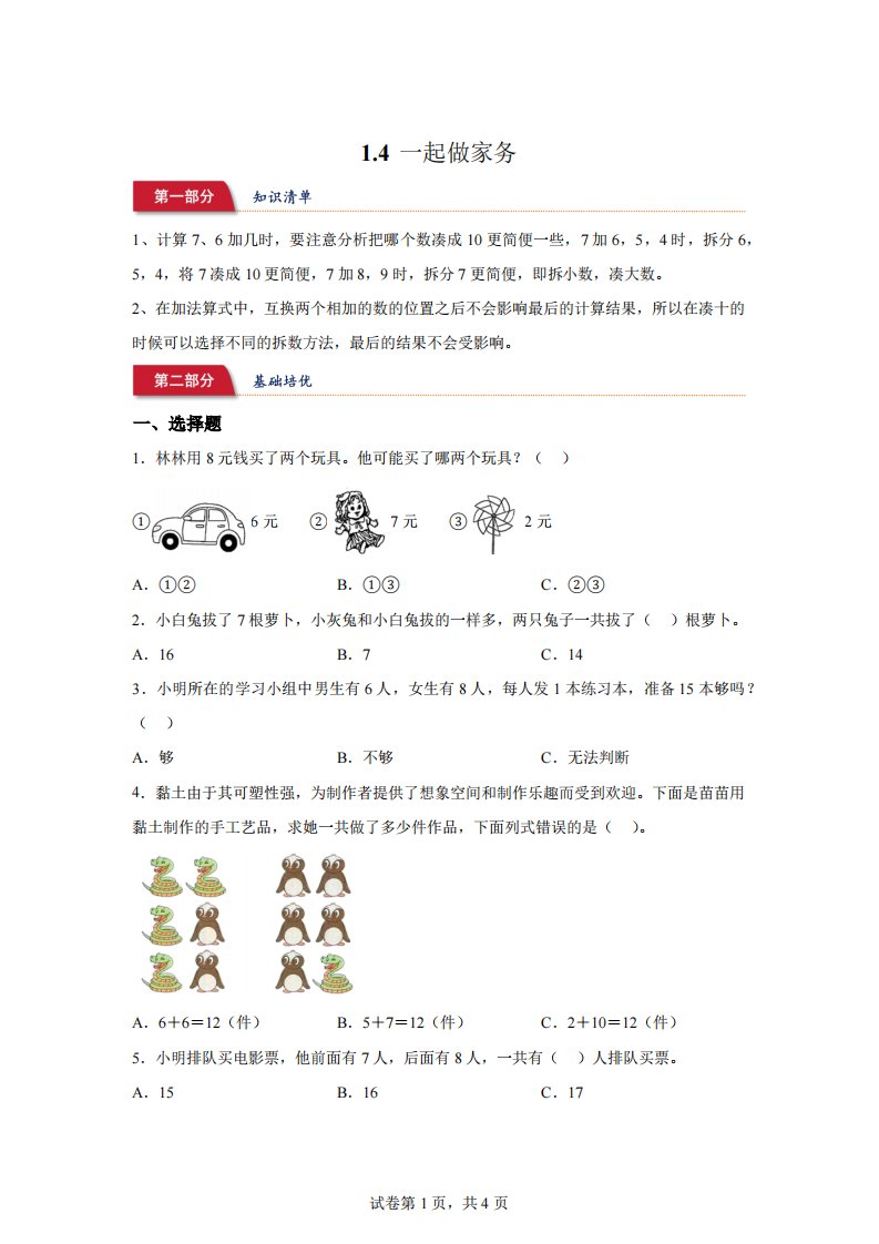 北师大版数学一年级下册1-4一起做家务练习卷_共8页