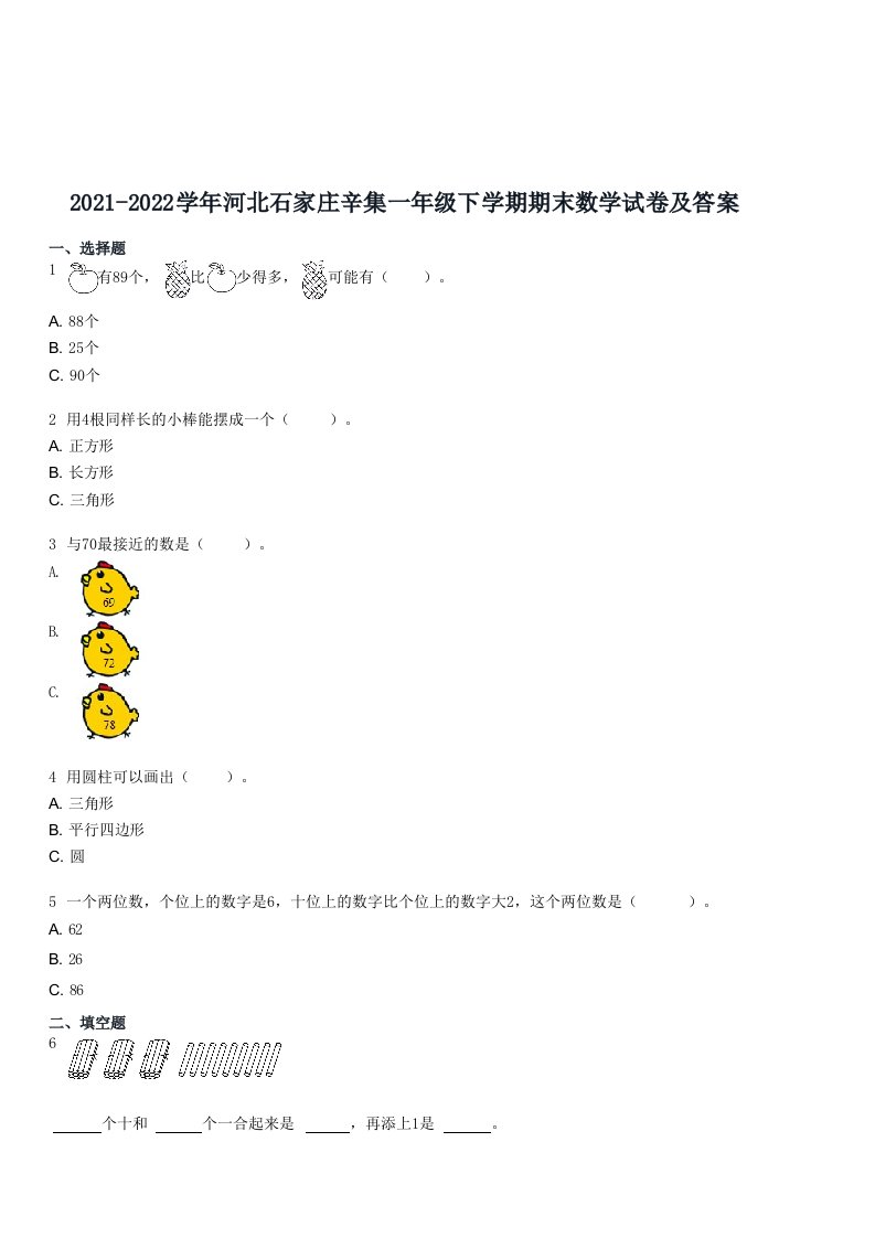 2021-2022学年河北石家庄辛集一年级下学期期末数学试卷及答案(Word版)_共13页