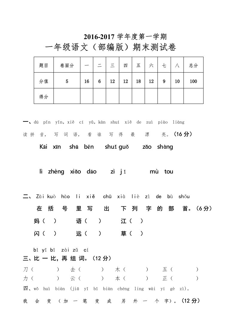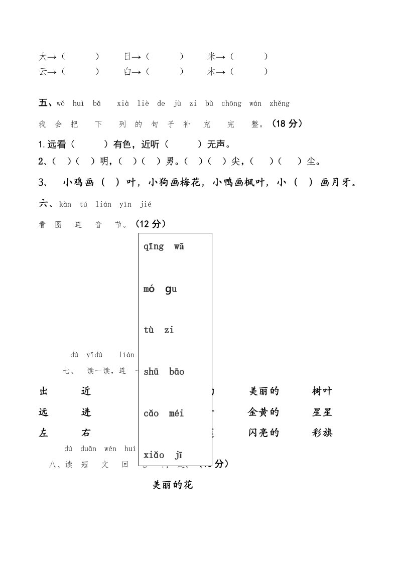 一年级语文上册上期末卷(五)(部编版)_共3页