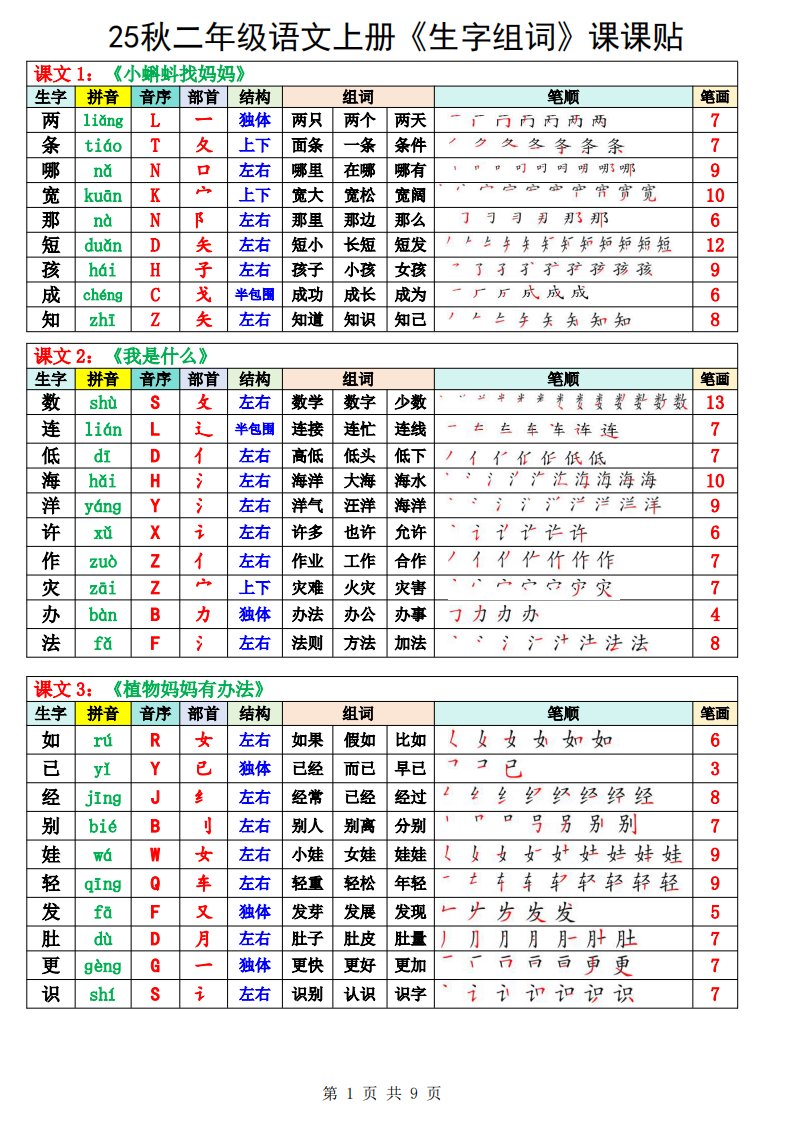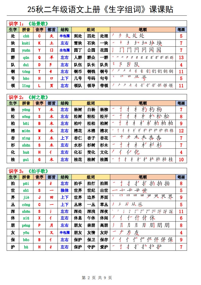 二年级上册语文《生字组词课课贴》(25秋)_共9页