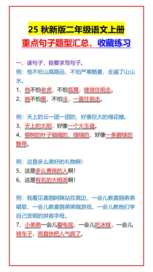 当前位置: 首页小学资源小学二年级正文 【2025秋新版】二年级语文上册重点句子题型汇总,收藏练习_共4页 小学二年级 2 周前 0 0 5 以上为部分内容预览,如需源文档请登录您的会员账号进行下载! 声明:本站所有文章,如无特殊说明或标注,均为本站原创发布。任何个人或组织,在未征得本站同意时,禁止复制、盗用、采集、发布本站内容到任何网站、书籍等各类媒体平台。如若本站内容侵犯了原著者的合法权益,可联系我们进行处理。 尚学资源永久会员 打赏 收藏 海报 链接