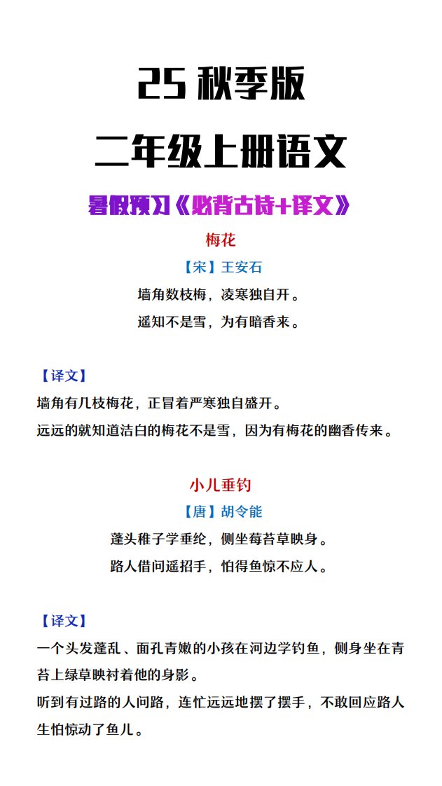 当前位置: 首页小学资源小学二年级正文 【2025秋新版】二年级上册语文必背古诗译文_共4页 小学二年级 2 周前 0 0 5 以上为部分内容预览,如需源文档请登录您的会员账号进行下载! 声明:本站所有文章,如无特殊说明或标注,均为本站原创发布。任何个人或组织,在未征得本站同意时,禁止复制、盗用、采集、发布本站内容到任何网站、书籍等各类媒体平台。如若本站内容侵犯了原著者的合法权益,可联系我们进行处理。 尚学资源永久会员 打赏 收藏 海报 链接