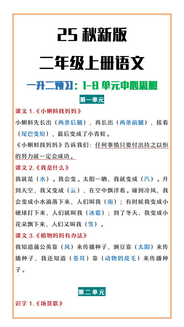 当前位置: 首页小学资源小学二年级正文 【2025秋新版】二年级上册语文1-8单元中心思想总结_共8页 小学二年级 2 周前 0 0 5 以上为部分内容预览,如需源文档请登录您的会员账号进行下载! 声明:本站所有文章,如无特殊说明或标注,均为本站原创发布。任何个人或组织,在未征得本站同意时,禁止复制、盗用、采集、发布本站内容到任何网站、书籍等各类媒体平台。如若本站内容侵犯了原著者的合法权益,可联系我们进行处理。 尚学资源永久会员 打赏 收藏 海报 链接