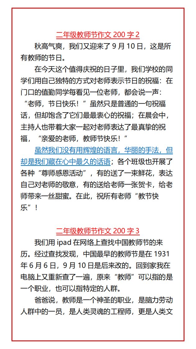当前位置: 首页小学资源小学二年级正文 【2025秋新版】小学二年级必写教师节优秀作文10篇汇总-二上语文_共7页 小学二年级 2 周前 0 0 5 以上为部分内容预览,如需源文档请登录您的会员账号进行下载! 声明:本站所有文章,如无特殊说明或标注,均为本站原创发布。任何个人或组织,在未征得本站同意时,禁止复制、盗用、采集、发布本站内容到任何网站、书籍等各类媒体平台。如若本站内容侵犯了原著者的合法权益,可联系我们进行处理。 尚学资源永久会员 打赏 收藏 海报 链接