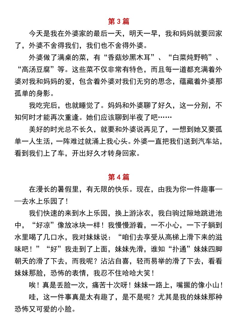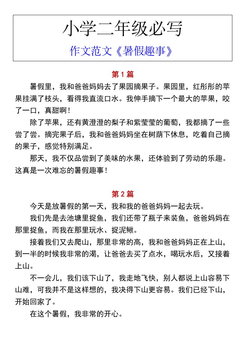 当前位置: 首页小学资源小学二年级正文 小学二年级上册语文必写作文范文《暑假趣事》_共3页 小学二年级 2 周前 0 0 5 以上为部分内容预览,如需源文档请登录您的会员账号进行下载! 声明:本站所有文章,如无特殊说明或标注,均为本站原创发布。任何个人或组织,在未征得本站同意时,禁止复制、盗用、采集、发布本站内容到任何网站、书籍等各类媒体平台。如若本站内容侵犯了原著者的合法权益,可联系我们进行处理。 尚学资源永久会员 打赏 收藏 海报 链接