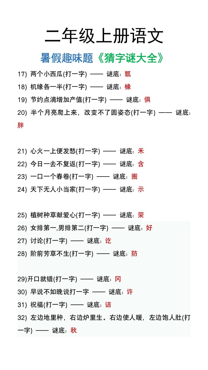 二年级上册语文猜字谜大全暑假趣味作业_共2页