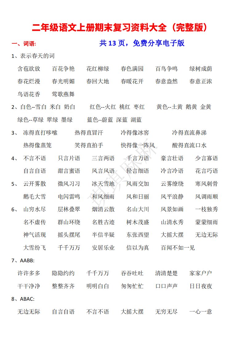 当前位置: 首页小学资源小学二年级正文 二年级语文上册期末复习资料大全(完整版)_共13页 小学二年级 2 周前 0 0 10 以上为部分内容预览,如需源文档请登录您的会员账号进行下载! 声明:本站所有文章,如无特殊说明或标注,均为本站原创发布。任何个人或组织,在未征得本站同意时,禁止复制、盗用、采集、发布本站内容到任何网站、书籍等各类媒体平台。如若本站内容侵犯了原著者的合法权益,可联系我们进行处理。 尚学资源永久会员 打赏 收藏 海报 链接
