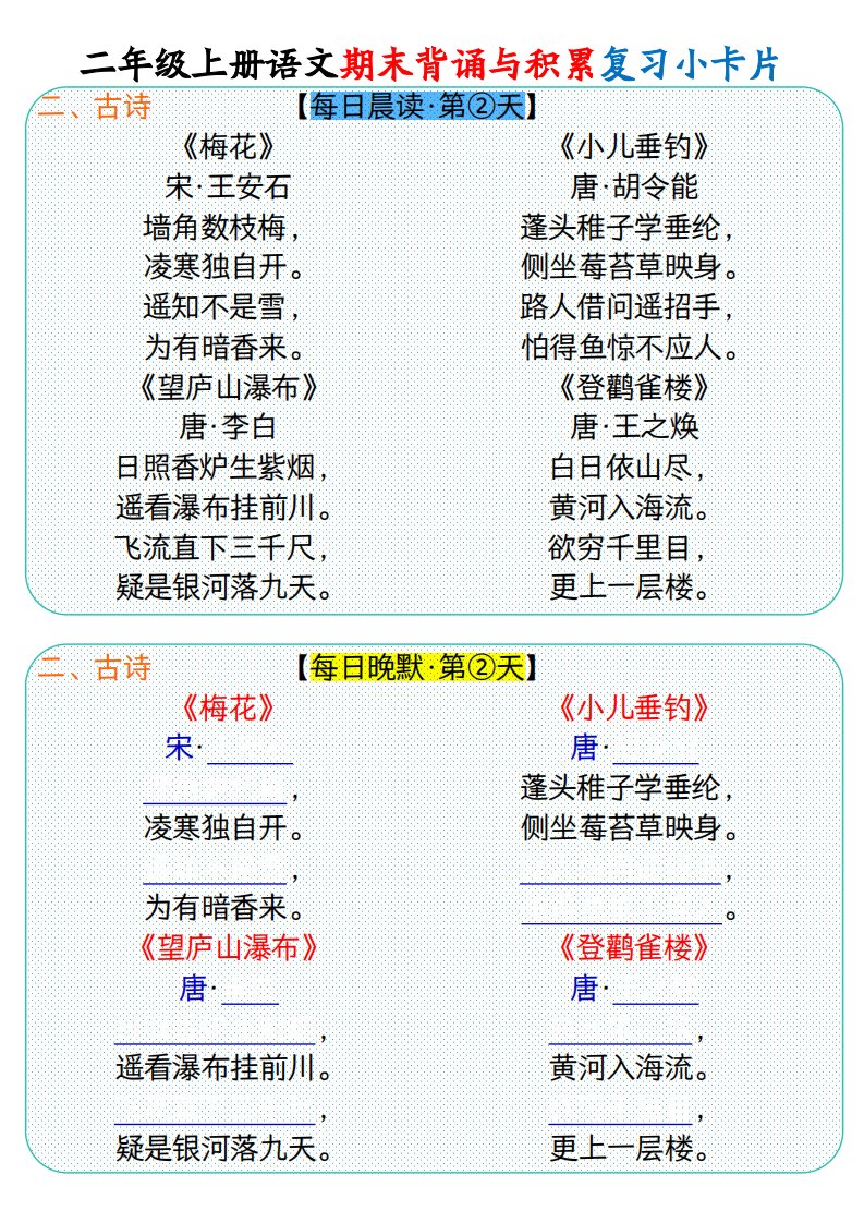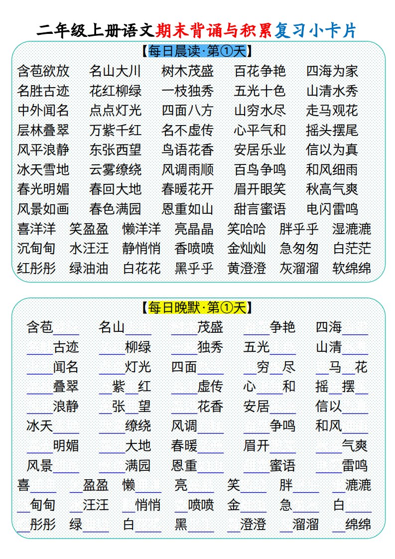 当前位置: 首页小学资源小学二年级正文 二上册语文期末背诵与积累复习小卡片(9页)(1)_共9页 小学二年级 2 周前 0 0 5 以上为部分内容预览,如需源文档请登录您的会员账号进行下载! 声明:本站所有文章,如无特殊说明或标注,均为本站原创发布。任何个人或组织,在未征得本站同意时,禁止复制、盗用、采集、发布本站内容到任何网站、书籍等各类媒体平台。如若本站内容侵犯了原著者的合法权益,可联系我们进行处理。 尚学资源永久会员 打赏 收藏 海报 链接