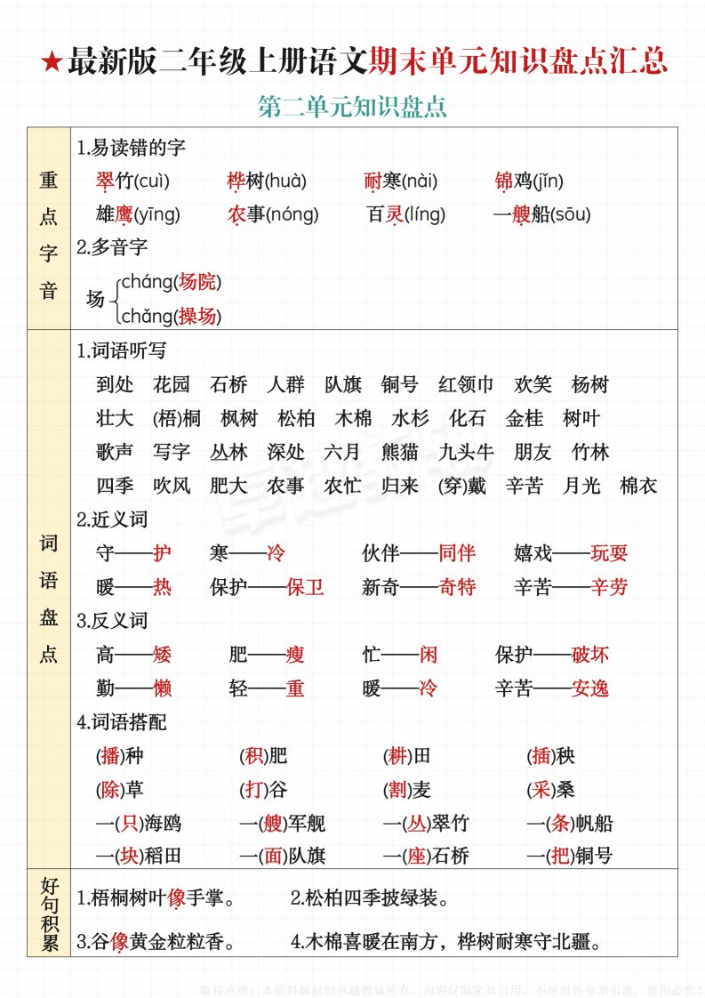 当前位置: 首页小学资源小学二年级正文 【最新版-期末单元知识盘点汇总】二上语文_共8页 小学二年级 2 周前 0 0 5 以上为部分内容预览,如需源文档请登录您的会员账号进行下载! 声明:本站所有文章,如无特殊说明或标注,均为本站原创发布。任何个人或组织,在未征得本站同意时,禁止复制、盗用、采集、发布本站内容到任何网站、书籍等各类媒体平台。如若本站内容侵犯了原著者的合法权益,可联系我们进行处理。 尚学资源永久会员 打赏 收藏 海报 链接