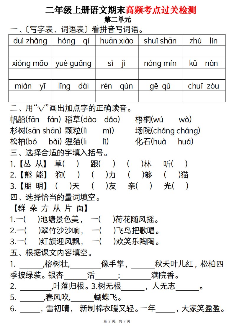 当前位置: 首页小学资源小学二年级正文 二上语文1-8单元期末高频考点过关检测(8页)_共8页 小学二年级 2 周前 0 0 5 以上为部分内容预览,如需源文档请登录您的会员账号进行下载! 声明:本站所有文章,如无特殊说明或标注,均为本站原创发布。任何个人或组织,在未征得本站同意时,禁止复制、盗用、采集、发布本站内容到任何网站、书籍等各类媒体平台。如若本站内容侵犯了原著者的合法权益,可联系我们进行处理。 尚学资源永久会员 打赏 收藏 海报 链接