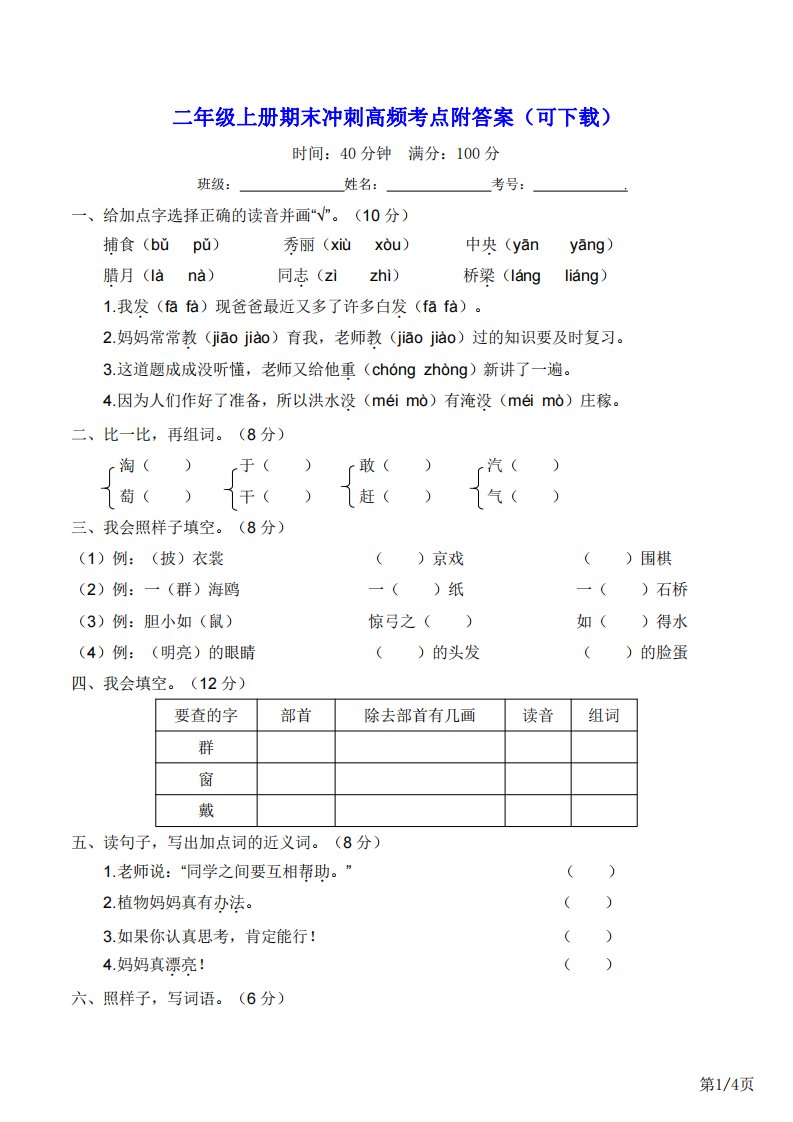 当前位置: 首页小学资源小学二年级正文 二年级上册语文期末冲刺高频考点附答案(可下载)_共4页 小学二年级 2 周前 0 0 5 以上为部分内容预览,如需源文档请登录您的会员账号进行下载! 声明:本站所有文章,如无特殊说明或标注,均为本站原创发布。任何个人或组织,在未征得本站同意时,禁止复制、盗用、采集、发布本站内容到任何网站、书籍等各类媒体平台。如若本站内容侵犯了原著者的合法权益,可联系我们进行处理。 尚学资源永久会员 打赏 收藏 海报 链接