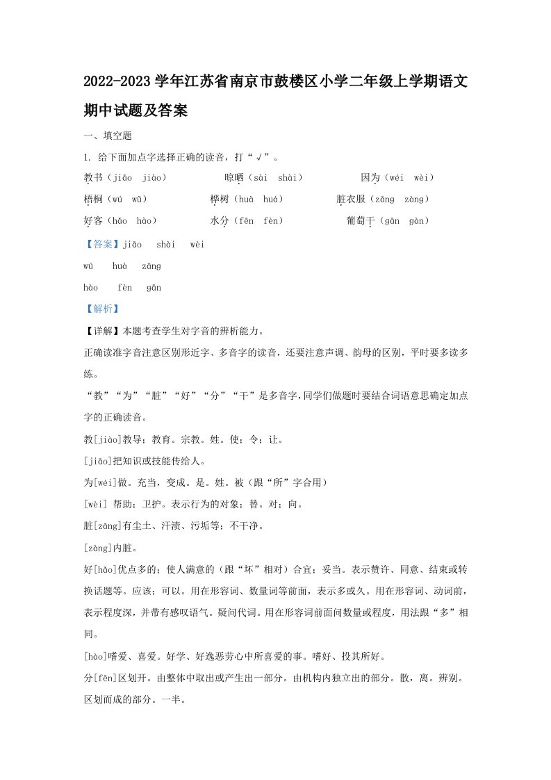2022-2023学年江苏省南京市鼓楼区小学二年级上学期语文期中试题及答案(Word版)_共11页