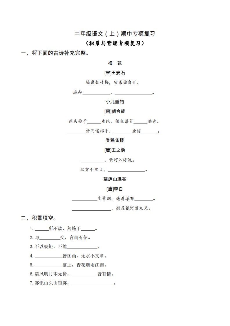 当前位置: 首页小学资源小学二年级正文 二(上)语文期中积累与背诵专项_共2页 小学二年级 2 周前 0 0 5 以上为部分内容预览,如需源文档请登录您的会员账号进行下载! 声明:本站所有文章,如无特殊说明或标注,均为本站原创发布。任何个人或组织,在未征得本站同意时,禁止复制、盗用、采集、发布本站内容到任何网站、书籍等各类媒体平台。如若本站内容侵犯了原著者的合法权益,可联系我们进行处理。 尚学资源永久会员 打赏 收藏 海报 链接