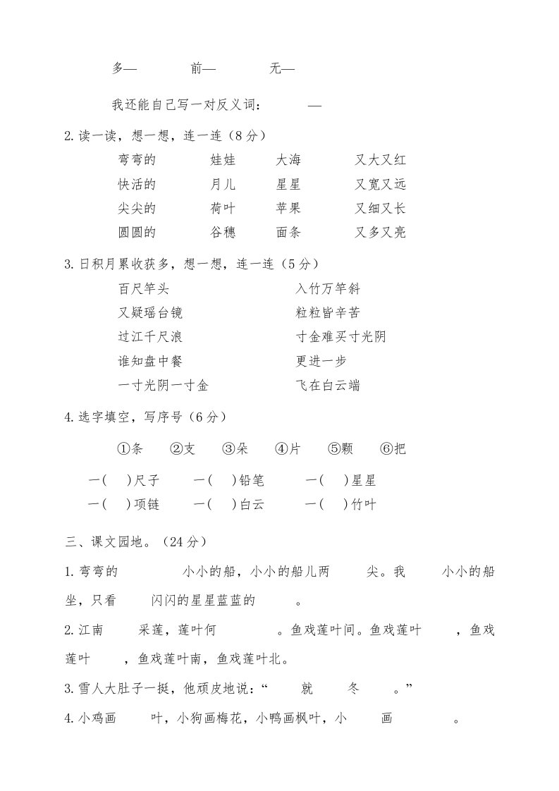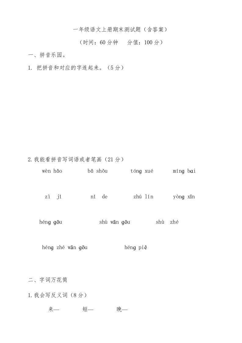 当前位置: 首页小学资源小学一年级正文 一年级语文上册(期末试题)-部编(21)(部编版)_共7页 小学一年级 2 周前 0 0 5 以上为部分内容预览,如需源文档请登录您的会员账号进行下载! 声明:本站所有文章,如无特殊说明或标注,均为本站原创发布。任何个人或组织,在未征得本站同意时,禁止复制、盗用、采集、发布本站内容到任何网站、书籍等各类媒体平台。如若本站内容侵犯了原著者的合法权益,可联系我们进行处理。 尚学资源永久会员 打赏 收藏 海报 链接