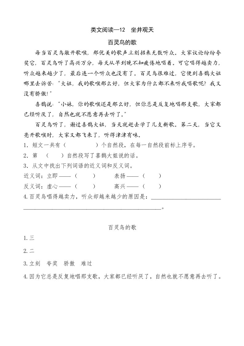 当前位置: 首页小学资源小学二年级正文 二年级语文上册类文阅读—12坐井观天(部编)_共3页 小学二年级 2 周前 0 0 5 以上为部分内容预览,如需源文档请登录您的会员账号进行下载! 声明:本站所有文章,如无特殊说明或标注,均为本站原创发布。任何个人或组织,在未征得本站同意时,禁止复制、盗用、采集、发布本站内容到任何网站、书籍等各类媒体平台。如若本站内容侵犯了原著者的合法权益,可联系我们进行处理。 尚学资源永久会员 打赏 收藏 海报 链接