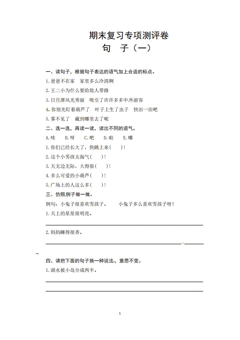 二年级语文上册期末复习句子专项测评卷(一)(供打印6页)(部编)_共6页