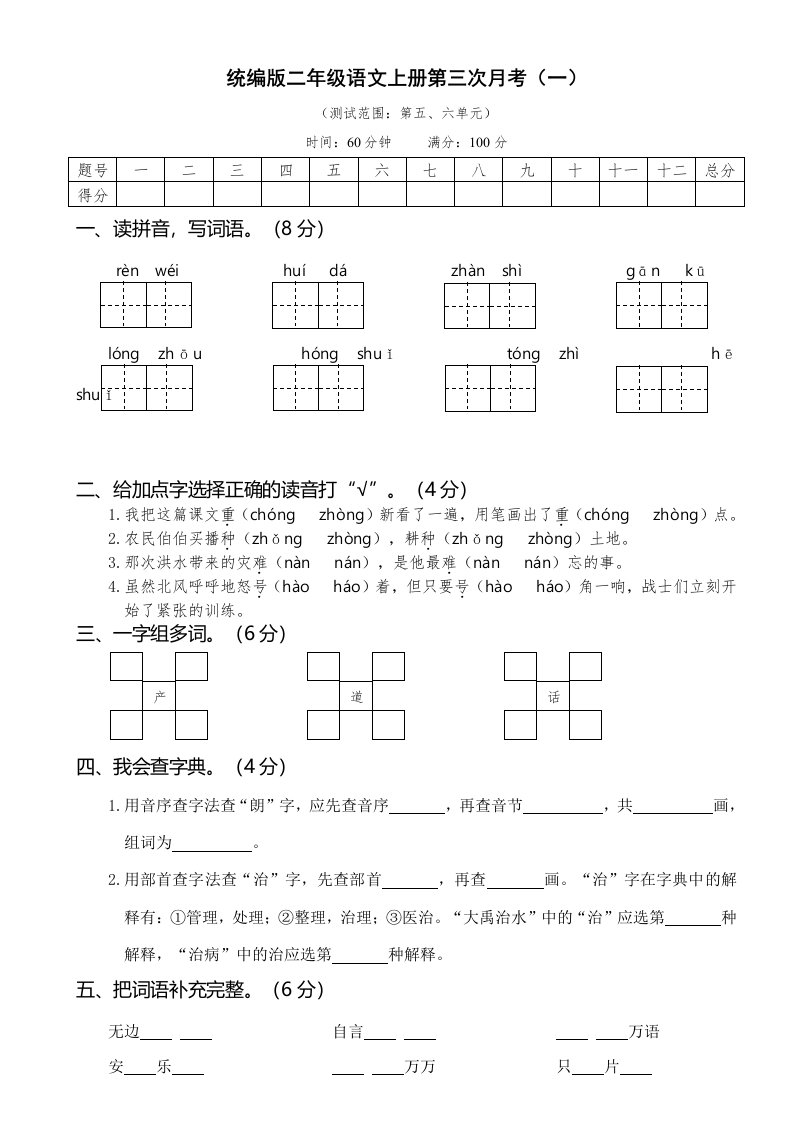 二年级语文上册05第三次月考(一)(1)(部编)_共10页