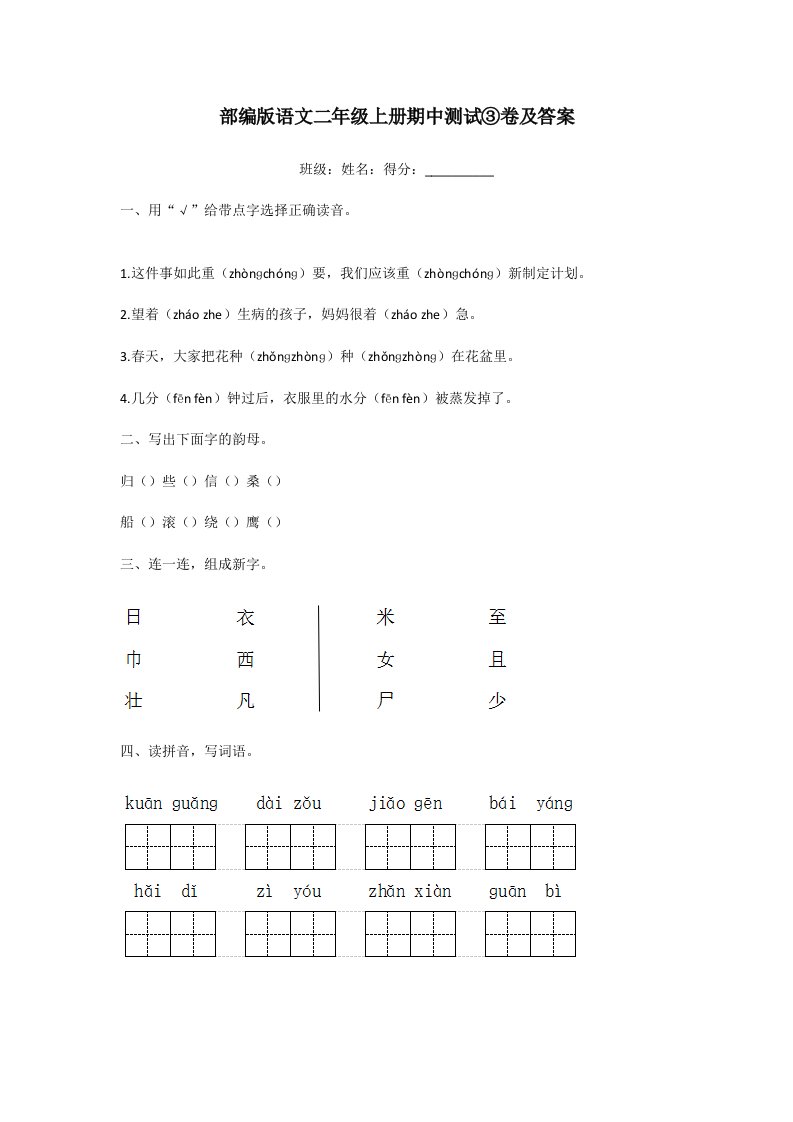二年级语文上册期中测试③卷及答案(部编)_共6页