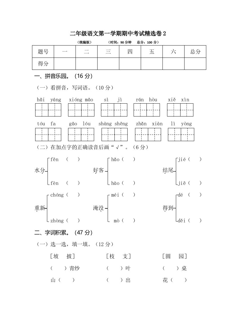 当前位置: 首页小学资源小学二年级正文 二年级语文上册第一学期期中考试精选卷2(部编)_共5页 小学二年级 2 周前 0 0 5 以上为部分内容预览,如需源文档请登录您的会员账号进行下载! 声明:本站所有文章,如无特殊说明或标注,均为本站原创发布。任何个人或组织,在未征得本站同意时,禁止复制、盗用、采集、发布本站内容到任何网站、书籍等各类媒体平台。如若本站内容侵犯了原著者的合法权益,可联系我们进行处理。 尚学资源永久会员 打赏 收藏 海报 链接
