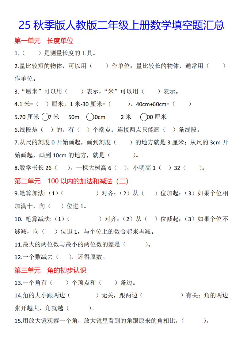 当前位置: 首页小学资源小学二年级正文 【2025秋新版】二年级上册数学1-8单元填空题汇总_共4页 小学二年级 2 周前 0 0 5 以上为部分内容预览,如需源文档请登录您的会员账号进行下载! 声明:本站所有文章,如无特殊说明或标注,均为本站原创发布。任何个人或组织,在未征得本站同意时,禁止复制、盗用、采集、发布本站内容到任何网站、书籍等各类媒体平台。如若本站内容侵犯了原著者的合法权益,可联系我们进行处理。 尚学资源永久会员 打赏 收藏 海报 链接