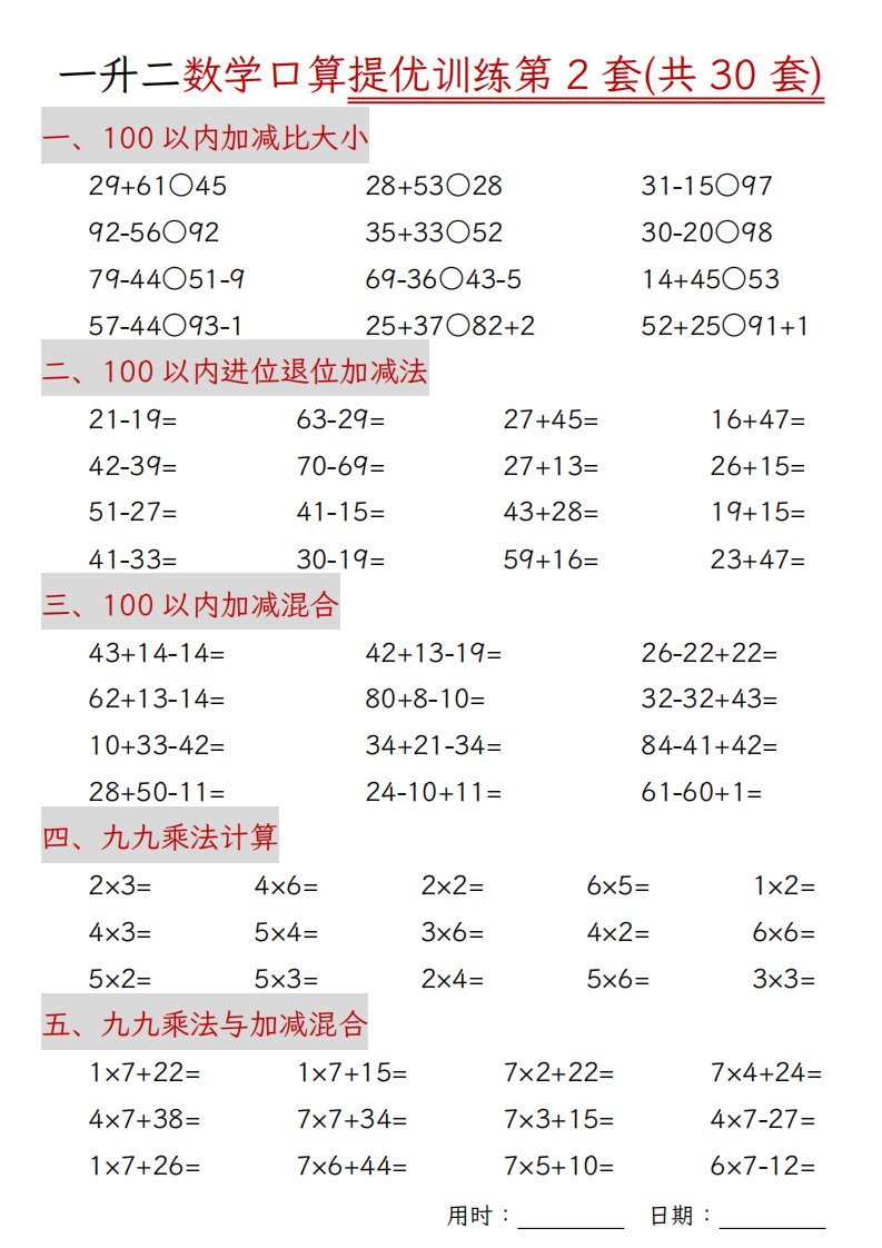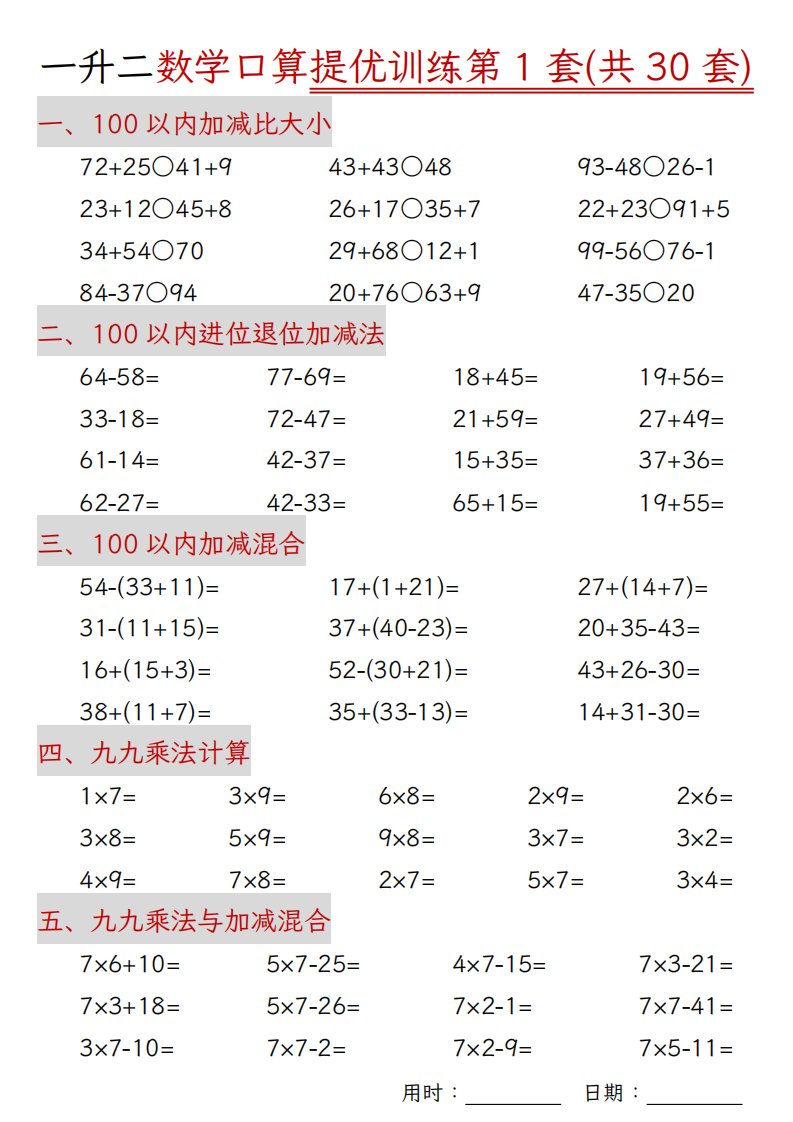 一升二数学口算提优训练30套30页-二上数学_共30页