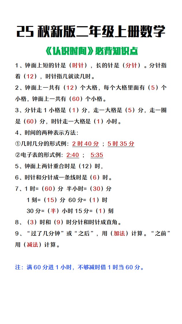 当前位置: 首页小学资源小学二年级正文 【2025秋新版】二年级上册数学认识时间必背知识点整理_共1页 小学二年级 2 周前 0 0 5 以上为部分内容预览,如需源文档请登录您的会员账号进行下载! 声明:本站所有文章,如无特殊说明或标注,均为本站原创发布。任何个人或组织,在未征得本站同意时,禁止复制、盗用、采集、发布本站内容到任何网站、书籍等各类媒体平台。如若本站内容侵犯了原著者的合法权益,可联系我们进行处理。 尚学资源永久会员 打赏 收藏 海报 链接