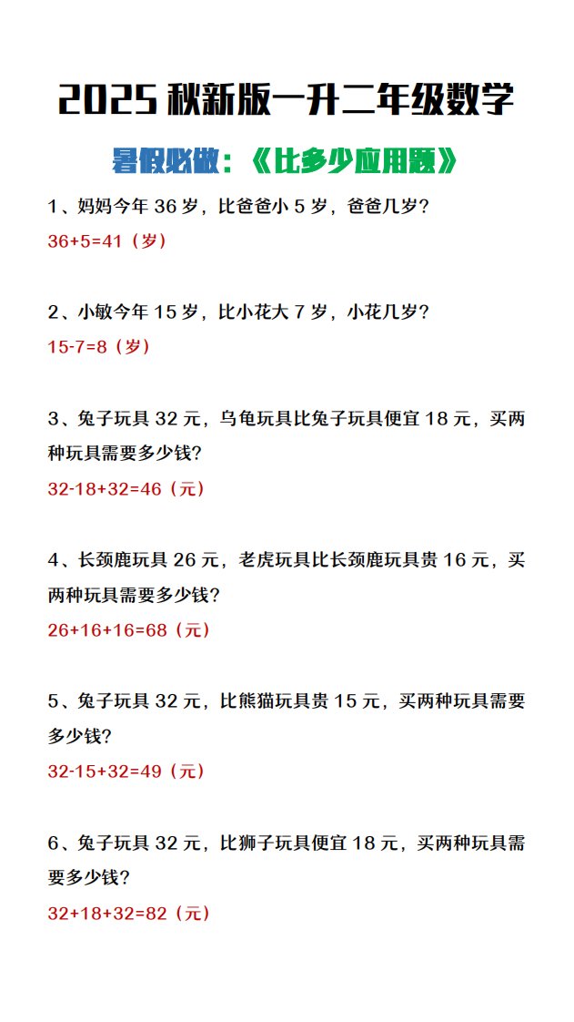 当前位置: 首页小学资源小学二年级正文 【2025秋新版】二年级上册数学暑假必做《比多少应用题》_共3页 小学二年级 2 周前 0 0 5 以上为部分内容预览,如需源文档请登录您的会员账号进行下载! 声明:本站所有文章,如无特殊说明或标注,均为本站原创发布。任何个人或组织,在未征得本站同意时,禁止复制、盗用、采集、发布本站内容到任何网站、书籍等各类媒体平台。如若本站内容侵犯了原著者的合法权益,可联系我们进行处理。 尚学资源永久会员 打赏 收藏 海报 链接