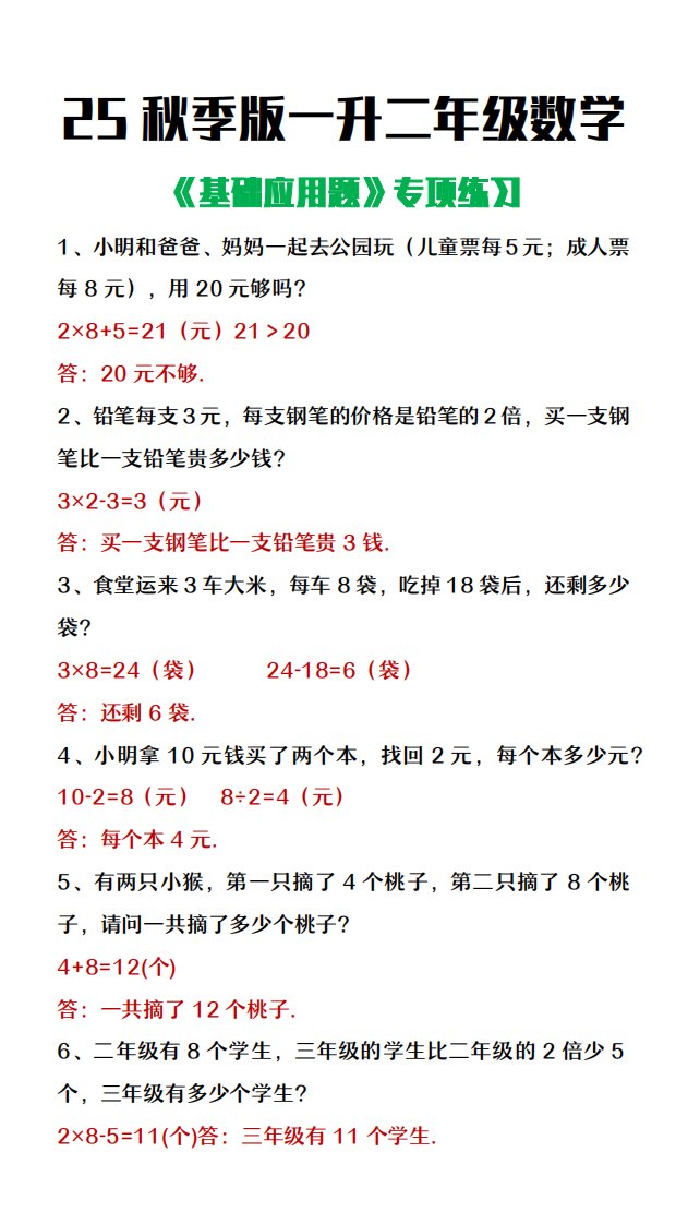 当前位置: 首页小学资源小学二年级正文 【2025秋新版】一升二年级数学常考基础应用题专项练习-二上数学_共3页 小学二年级 2 周前 0 0 5 以上为部分内容预览,如需源文档请登录您的会员账号进行下载! 声明:本站所有文章,如无特殊说明或标注,均为本站原创发布。任何个人或组织,在未征得本站同意时,禁止复制、盗用、采集、发布本站内容到任何网站、书籍等各类媒体平台。如若本站内容侵犯了原著者的合法权益,可联系我们进行处理。 尚学资源永久会员 打赏 收藏 海报 链接