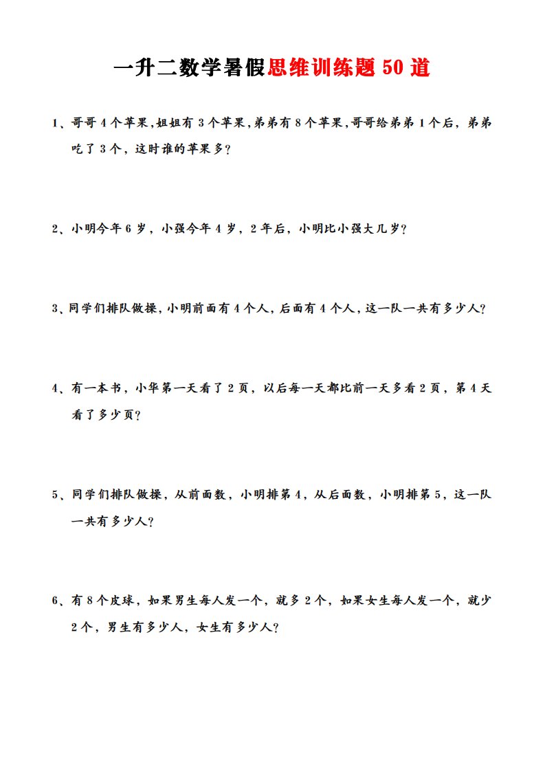 当前位置: 首页小学资源小学二年级正文 一升二数学暑假思维应用题训练50题-二上数学_共11页 小学二年级 2 周前 0 0 10 以上为部分内容预览,如需源文档请登录您的会员账号进行下载! 声明:本站所有文章,如无特殊说明或标注,均为本站原创发布。任何个人或组织,在未征得本站同意时,禁止复制、盗用、采集、发布本站内容到任何网站、书籍等各类媒体平台。如若本站内容侵犯了原著者的合法权益,可联系我们进行处理。 尚学资源永久会员 打赏 收藏 海报 链接