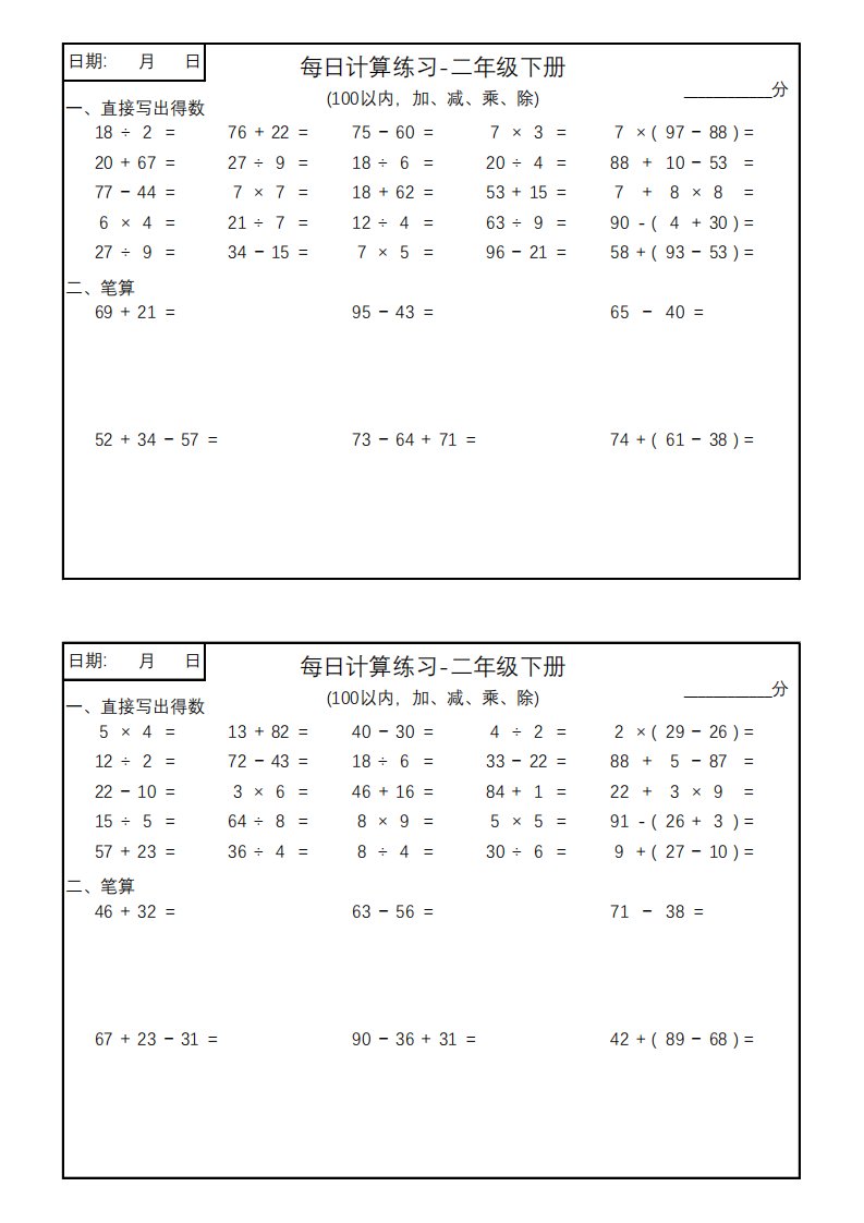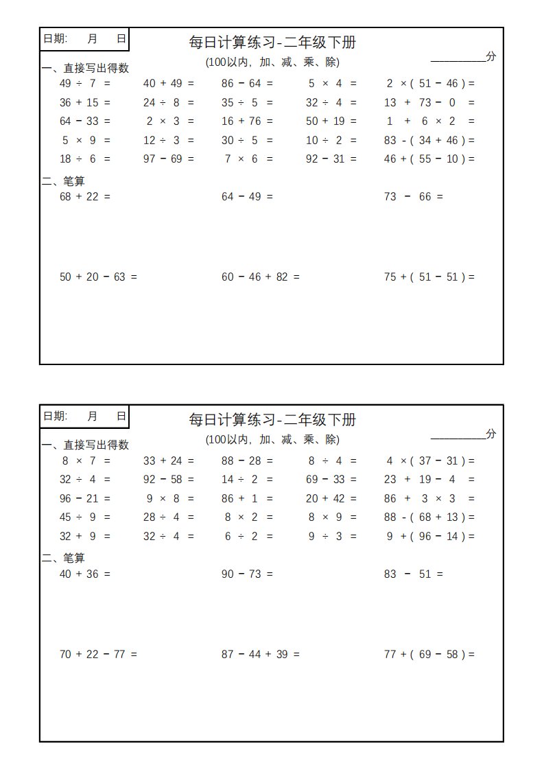 当前位置: 首页小学资源小学二年级正文 二年级数学100以内加减乘除每日计算练习【计算口算题】_共15页 小学二年级 2 周前 0 0 10 以上为部分内容预览,如需源文档请登录您的会员账号进行下载! 声明:本站所有文章,如无特殊说明或标注,均为本站原创发布。任何个人或组织,在未征得本站同意时,禁止复制、盗用、采集、发布本站内容到任何网站、书籍等各类媒体平台。如若本站内容侵犯了原著者的合法权益,可联系我们进行处理。 尚学资源永久会员 打赏 收藏 海报 链接