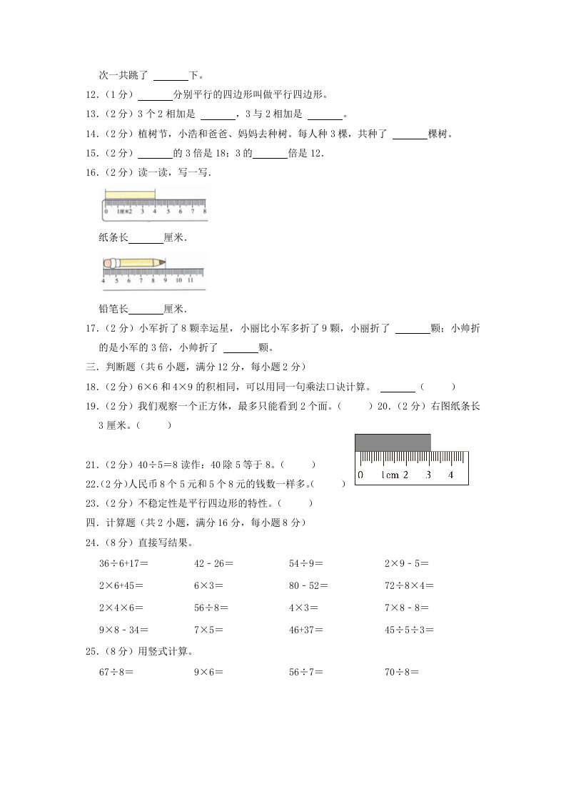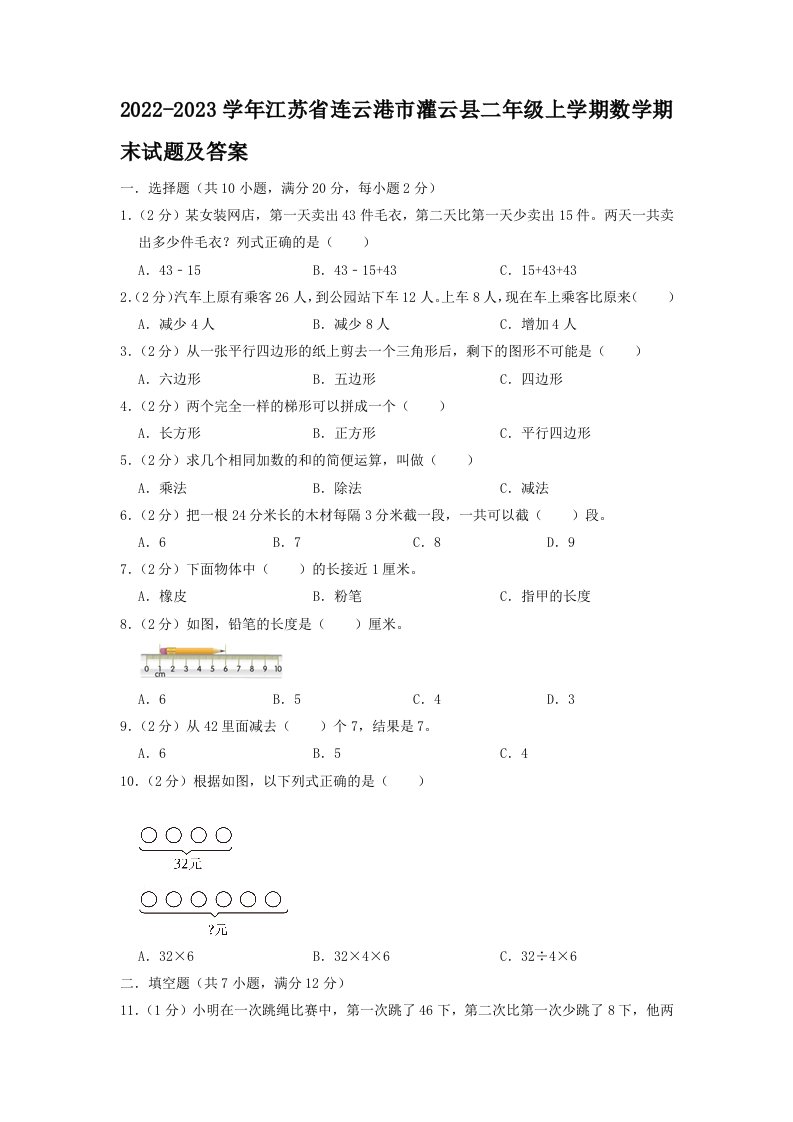 当前位置: 首页小学资源小学二年级正文 2022-2023学年江苏省连云港市灌云县二年级上学期数学期末试题及答案(Word版)_共8页 小学二年级 2 周前 0 0 5 以上为部分内容预览,如需源文档请登录您的会员账号进行下载! 声明:本站所有文章,如无特殊说明或标注,均为本站原创发布。任何个人或组织,在未征得本站同意时,禁止复制、盗用、采集、发布本站内容到任何网站、书籍等各类媒体平台。如若本站内容侵犯了原著者的合法权益,可联系我们进行处理。 尚学资源永久会员 打赏 收藏 海报 链接